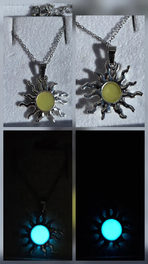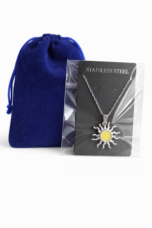 Ett dekorativt halsband med ett solformat hänge i silverfinish. I dagsljus framstår mitten av solen i en mjukt gul ton, medan smycket i mörker börjar lysa i ett blått sken.